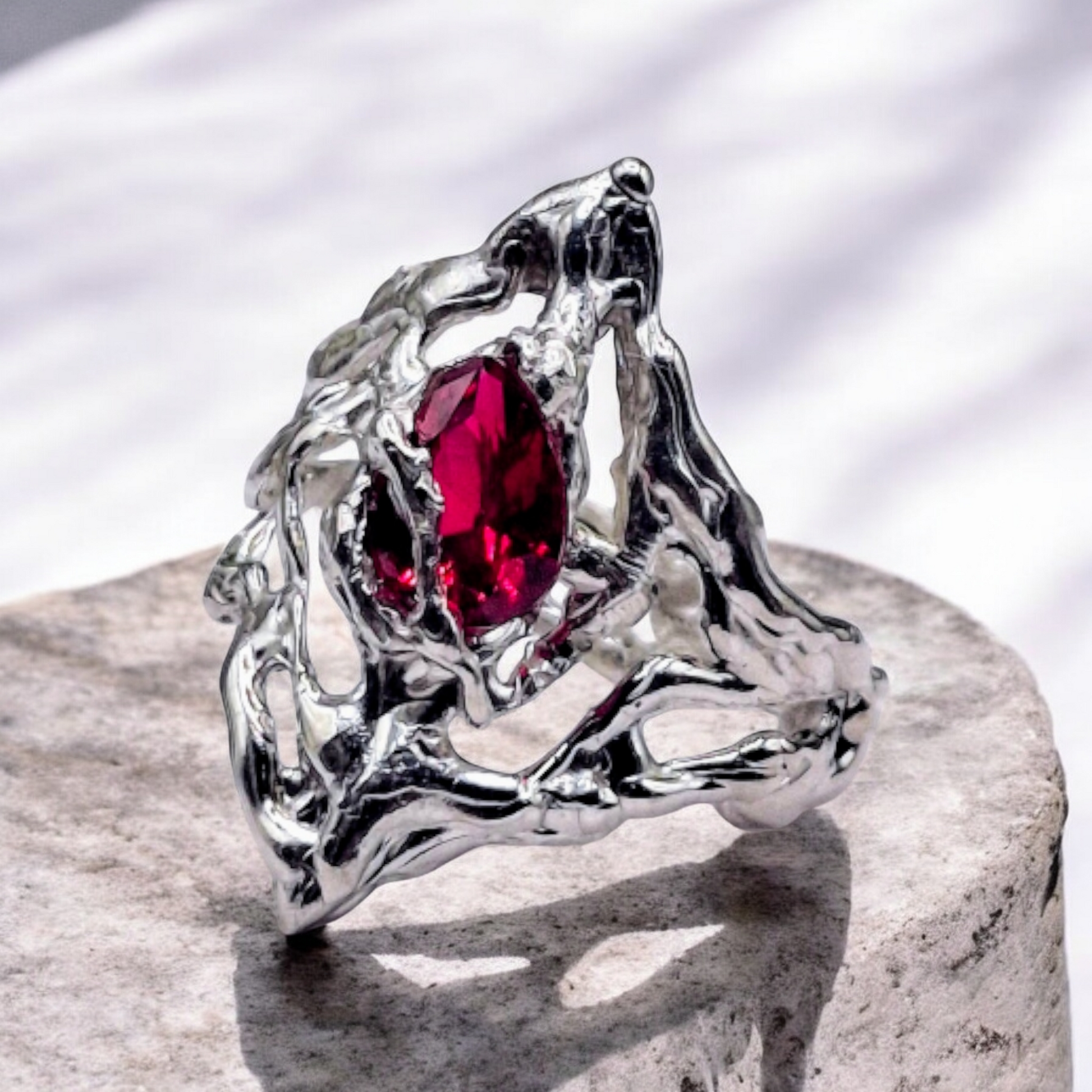 At its heart rests a luminous pear-cut lab ruby, its deep crimson hue shining like a celestial jewel beneath a crescent moon. Sized O, the ring balances bold colour with graceful simplicity, offering a statement that feels both magical and refined.